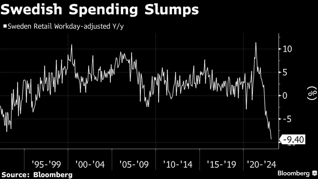 Last month’s retail sales fell 9.4% from a year earlier, led by a decline in durable goods, data from Statistics Sweden showed on Wednesday.