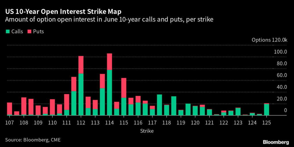 In June 10-year Treasury options, open interest remains elevated in 112.00 and 114.00 call strikes, suggesting outstanding risk remains in a $60 million bullish play from March 14 via a 10-year Jun23 112.00/114.00 call spread wager.