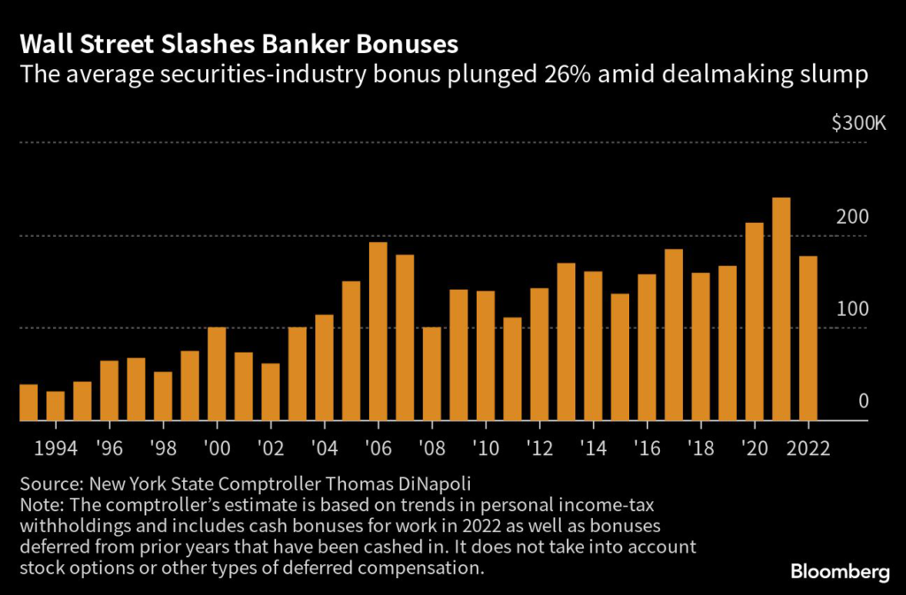 (Bloomberg) — The average Wall Street bonus plummeted 26% last year as a slump in dealmaking and banks’ efforts to contain costs weighed on compensation.
