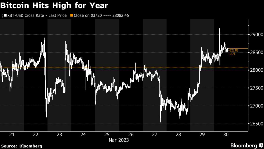 The largest cryptocurrency by market value rose as much as 2.7% to $29,171 during Asian trading hours, and was recently little changed at around $28,612.