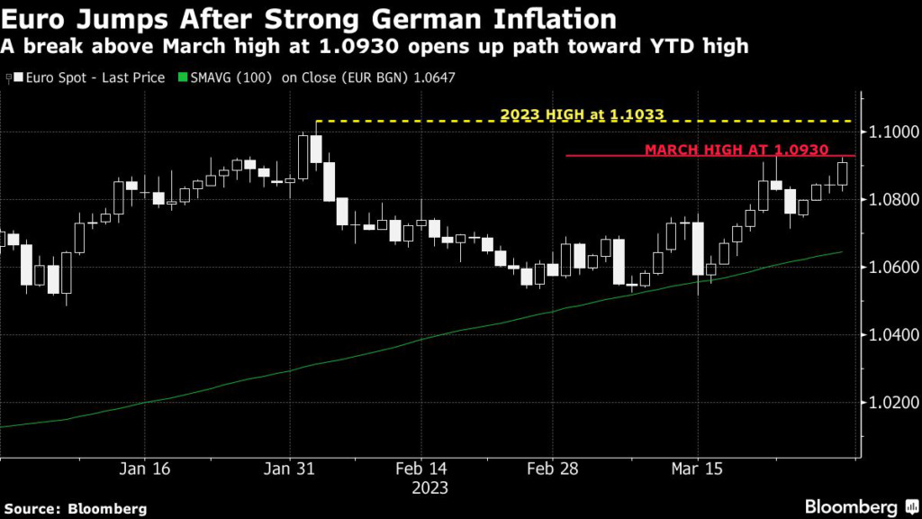 (Bloomberg) — The euro approached its strongest level against the dollar in nearly two months as risk sentiment improved and higher-than-estimated German inflation underpinned the outlook for rates in Europe.