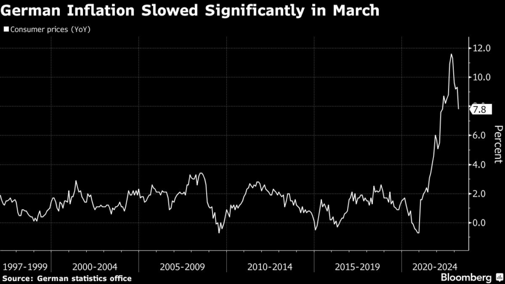 Consumer prices in Europe’s biggest economy rose 7.8% in March compared with 9.3% in February, the statistics office said Thursday.