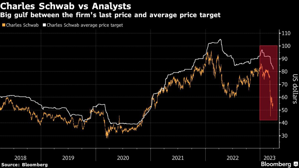 “While clients aren’t leaving and Schwab has other sources of liquidity, earnings face more pressure than we had expected,” Cyprys wrote, lowering his forecast for profit this year and next by 30%.