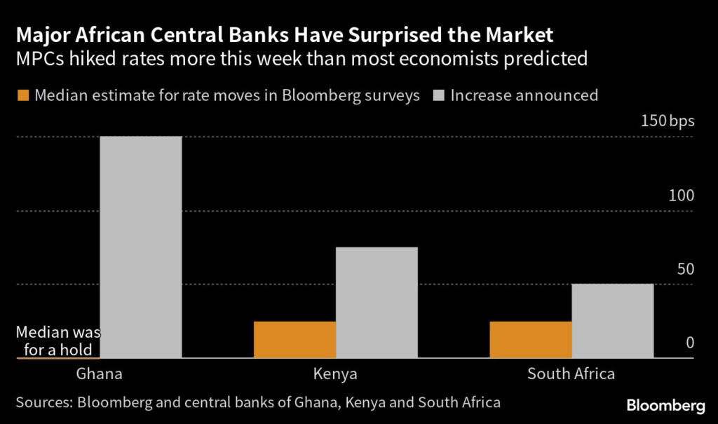 Monetary policy committees in Ghana, Kenya and South Africa announced hikes that beat the predictions of all economists in Bloomberg surveys.