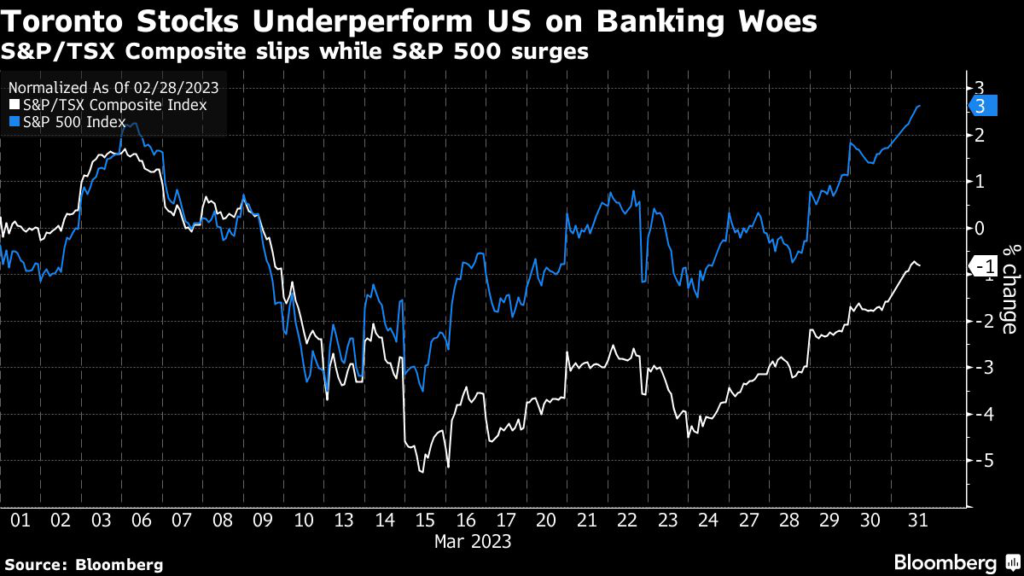 (Bloomberg) — Canada’s biggest banks have shed almost C$49 billion ($36 billion) in market value in March, making a loser of the country’s benchmark stock index while US equities are rising.