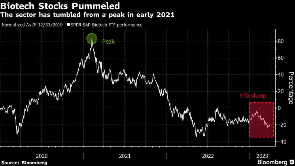 “Add in freshly renewed concerns about a lack of access to capital following the SVB situation, along with increased fear over drug pricing, and it’s no surprise that biotech is down,” Jefferies strategist Will Sevush said by email.