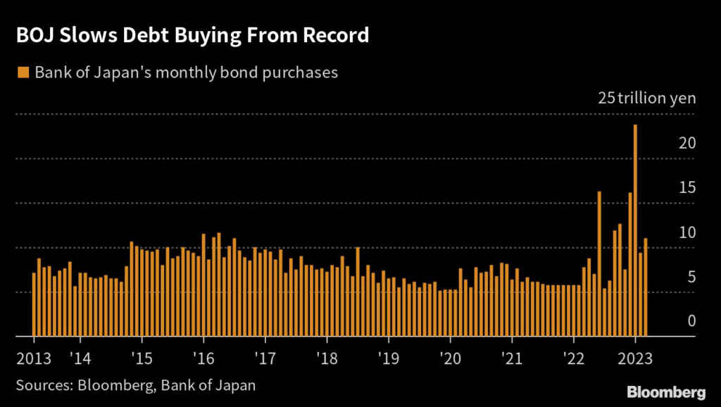 Japan’s 10-year yield has traded well below the 0.5% cap since March 10, when Silicon Valley Bank’s collapse jolted markets and spurred bets that the Federal Reserve will moderate its tightening.