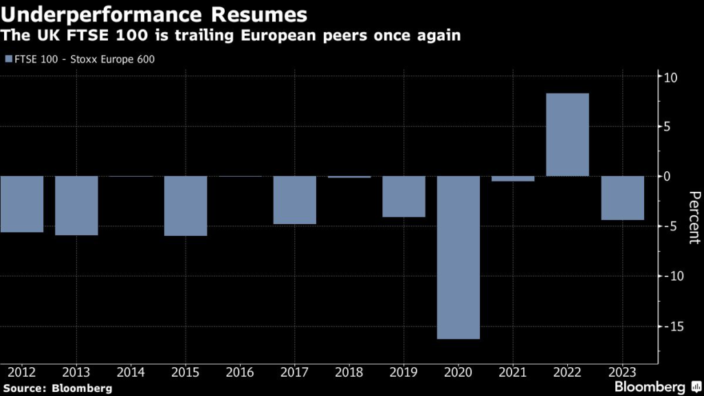 With a rise of 2.5% in 2023, the FTSE 100 has labored behind gains of 14% in the Euro Stoxx 50 and 8% in the Stoxx Europe 600, resuming a period of underperformance stretching back a decade.