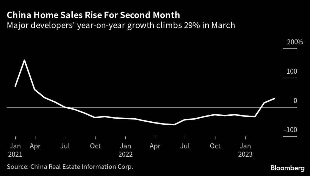(Bloomberg) — China’s home sales rose for a second month in March, according to a private data provider, signaling a recovery after policymakers expanded support for the sector.