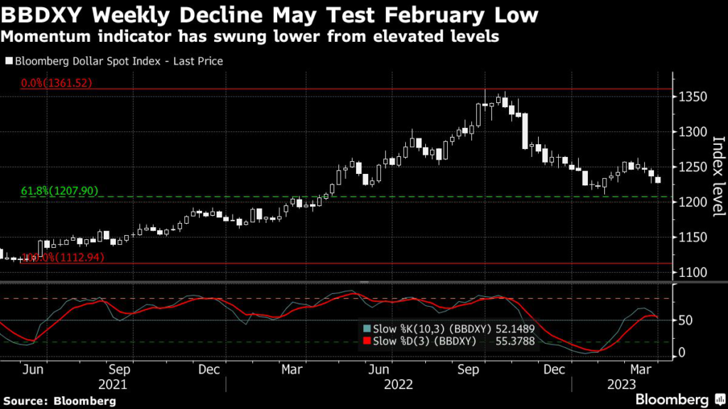 The Bloomberg dollar gauge is on track for a third weekly decline after authorities rushed to protect depositors’ money and increased emergency liquidity measures to contain the fallout from the collapse of some smaller lenders.