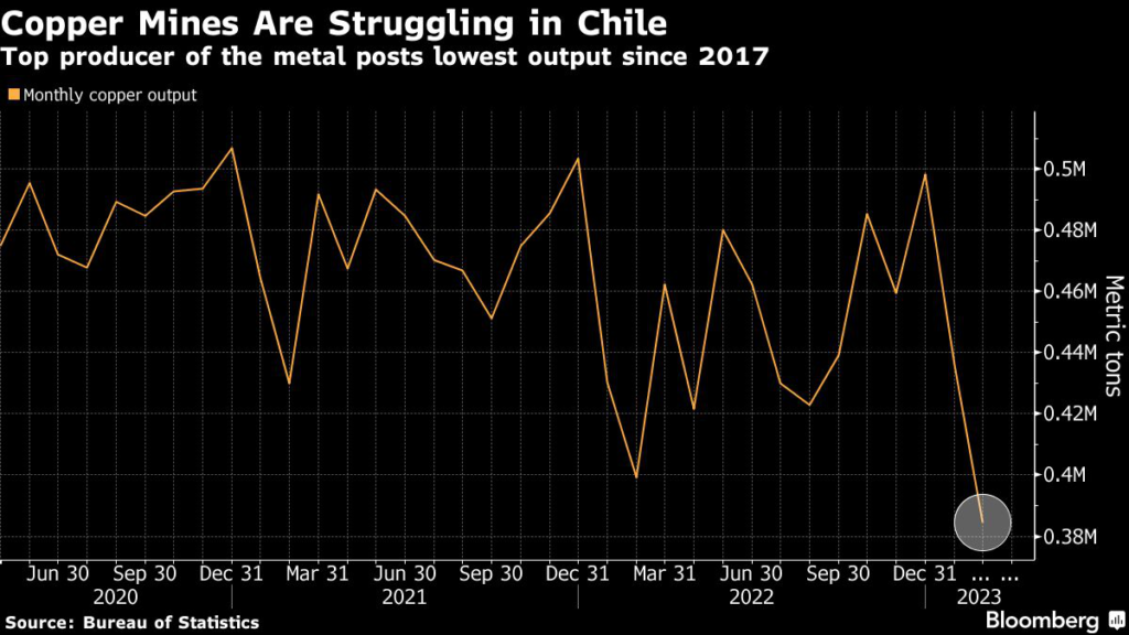 For the global copper market, declining Chilean production signals further tightening of supplies at a time when Chinese demand has picked up after the easing of pandemic restrictions.