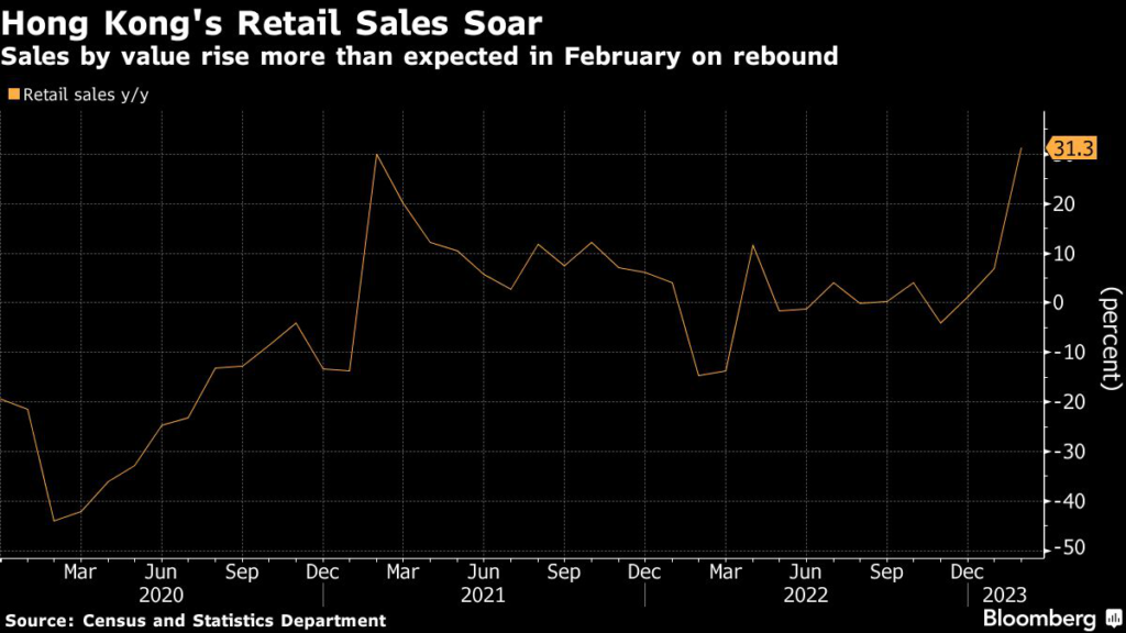 (Bloomberg) — Hong Kong’s retail sales grew at the fastest pace in more than a decade in February as spending surged during the Lunar New Year break and tourists from mainland China and elsewhere returned to the city.