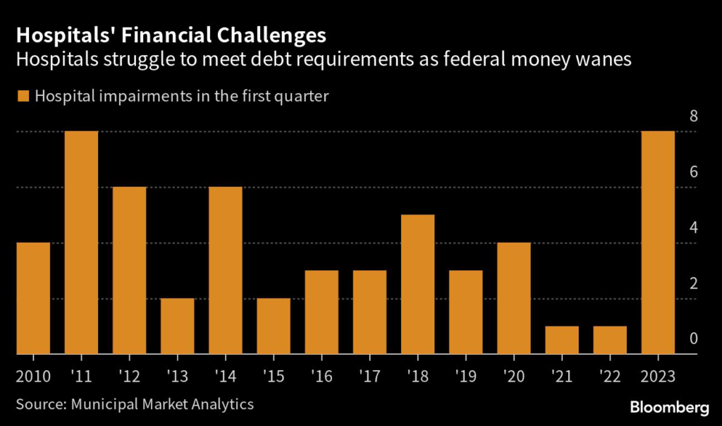In the worst start to the year in more than a decade, bonds of eight hospitals lapsed into impairment — meaning they experienced covenant issues amounting to a technical or monetary default — compared to just one last year, Municipal Market Analytics data show.