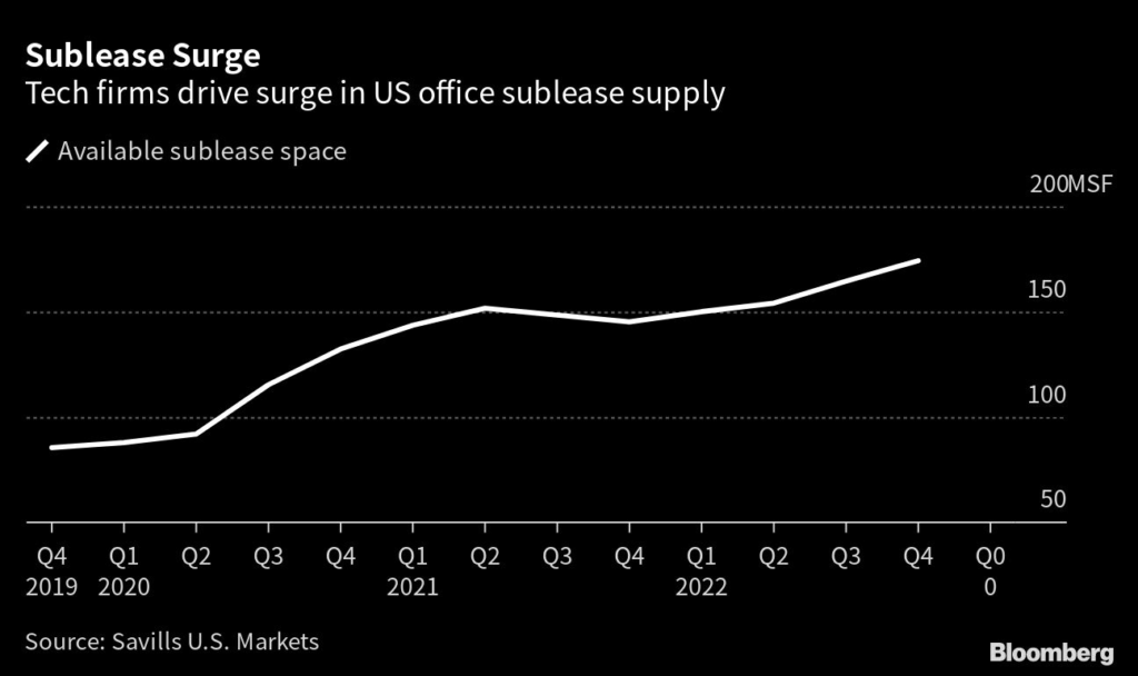 US tech giants, grappling with a post-pandemic slowdown, have already laid off tens of thousands of workers. Now they’re dumping millions of square feet of office space, pushing vacancies in city centers to record highs and ratcheting up pressure on the commercial real estate industry.