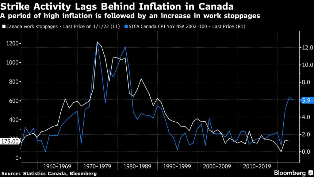 Historically, the period of high inflation in the 1970s and 1980s led to a surge in strikes and lockouts in the country, most of which lagged the run up in prices by several months and remained high several years after pressures abated, data on work stoppages in Canada show.