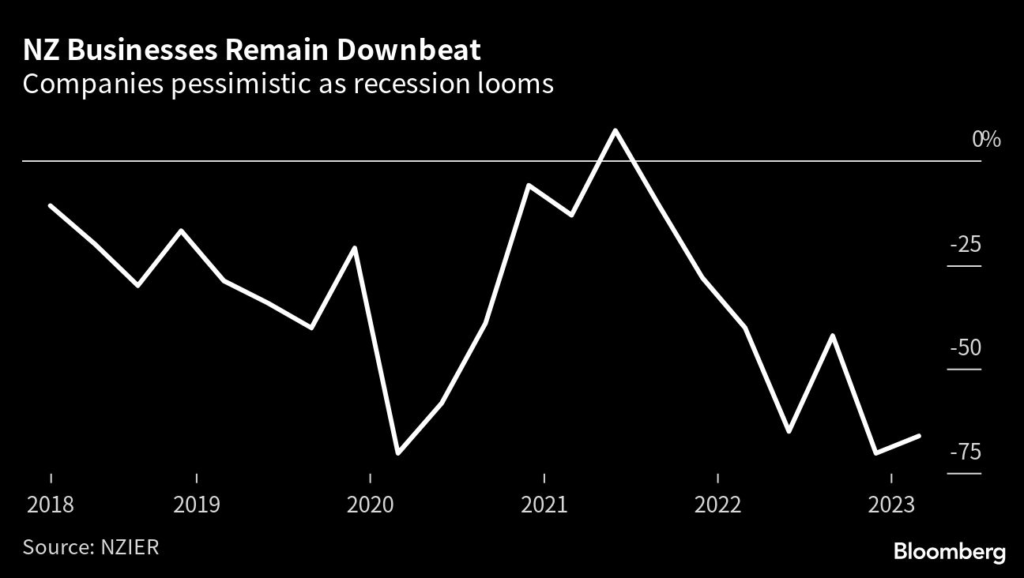 (Bloomberg) — New Zealand businesses remained downbeat in the first quarter as high interest rates and slowing demand push the nation toward recession.