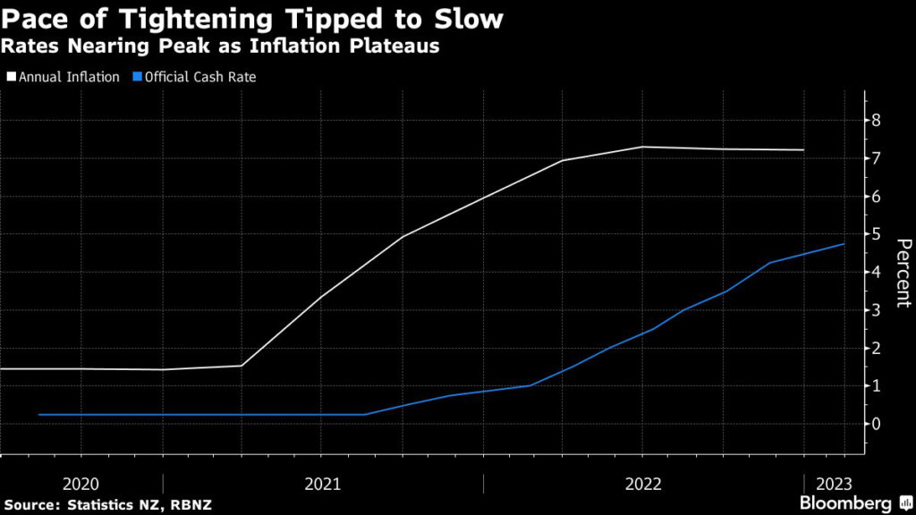(Bloomberg) — New Zealand’s central bank is expected to further slow the pace of interest-rate increases this week as a weakening economy suggests the end of its tightening cycle is near.
