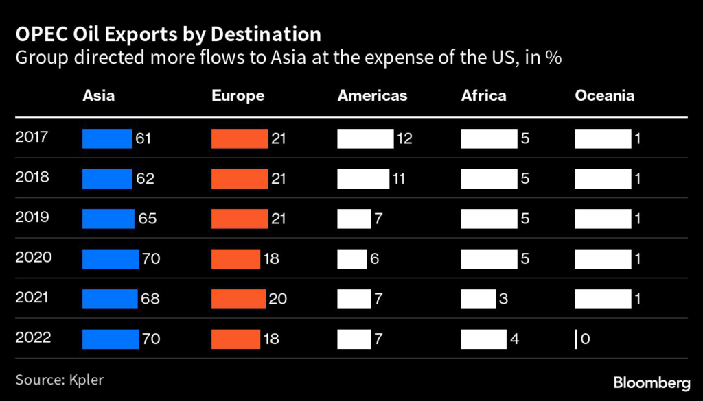 Last year, 70% of oil from the group went to Asian countries including China and India, up from 61% in 2017. Meanwhile, the share bound to the US shrank to 6% from 10%, data from market intelligence firm Kpler SAS show.