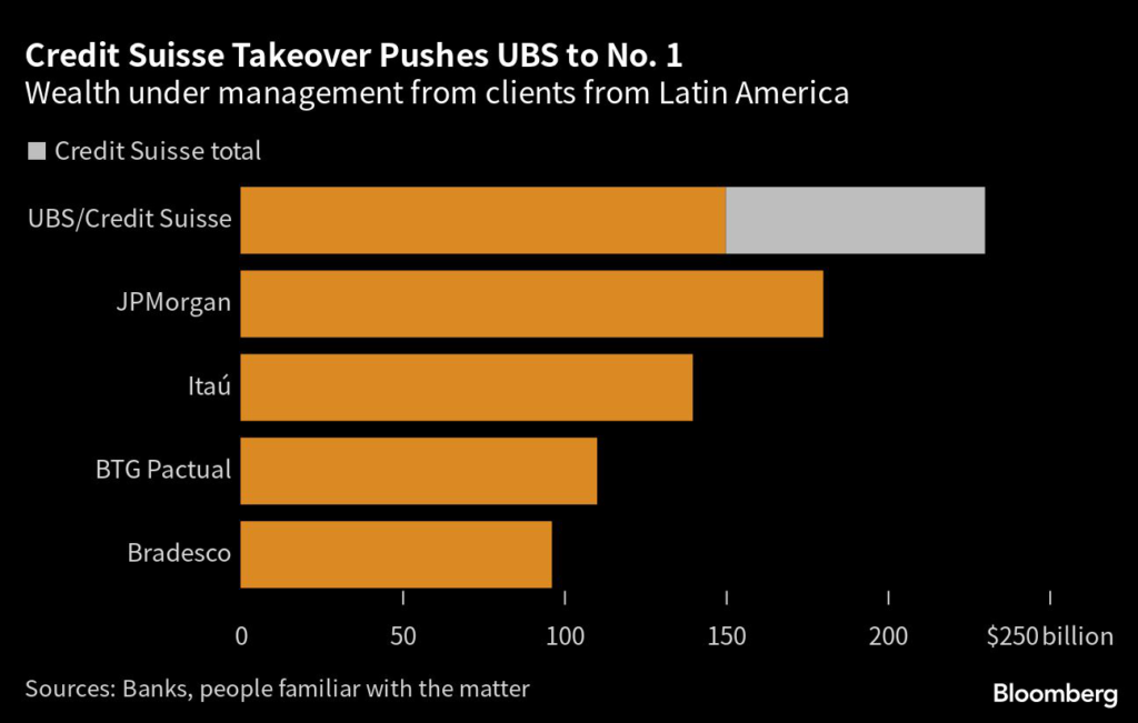 UBS Group AG will leapfrog JPMorgan Chase & Co. to become Latin America’s biggest wealth manager through its acquisition of Credit Suisse Group AG.