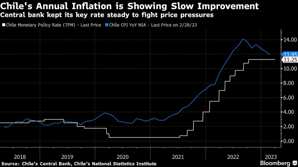 (Bloomberg) — Chile’s central bank raised its 2023 inflation forecasts in a closely-watched report published a day after the institution held its key interest rate steady and signaled that borrowing costs won’t be coming down until price increases are under control.