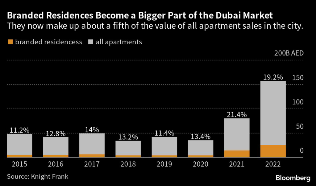 The swell push the value of branded apartments sold in Dubai in 2022 to a record 25.3 billion dirhams, making up nearly a fifth of the value all apartment purchases in the city, according to Knight Frank.