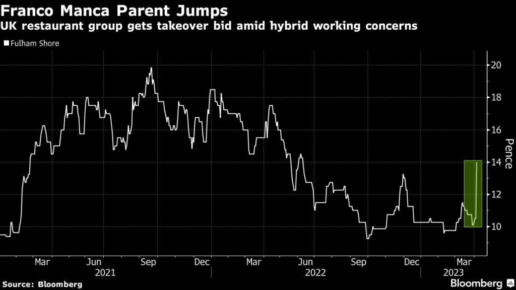 (Bloomberg) — Fulham Shore Plc’s stock soared Wednesday in London after the owner of the Franco Manca pizzeria chain received a takeover offer amid the company’s struggles in a hybrid-working world post Covid.