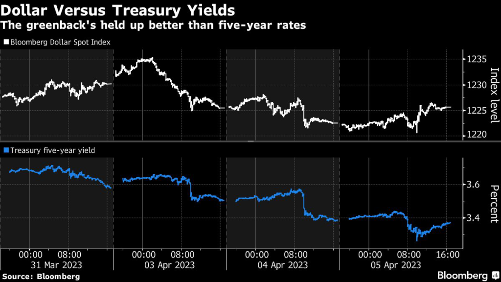 (Bloomberg) — The dollar has failed to weaken as much as might be suggested by the decline in US bond yields versus international peers, in large part because haven flows into the greenback are helping to prop it up.