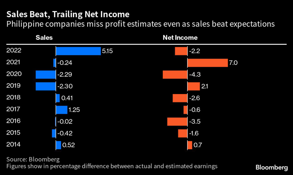 Philippine companies beat 2022 consensus revenue estimates by the widest gap in at least nine years. Profit, however, lagged behind projections, as high interest rates and inflation hurt margins.