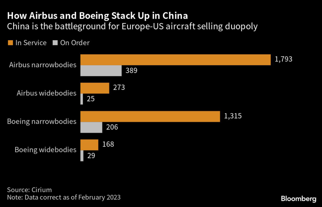 Chinese carriers ordered more than 300 narrow-body aircraft from Airbus last year, valued at more than $40 billion before customary discounts. Airlines in China make up about a fifth of Airbus deliveries.