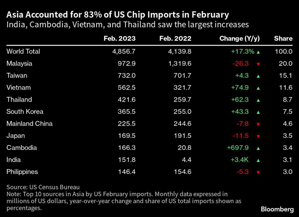 US imports of chips grew 17% from last year to $4.86 billion in February, according to US Census data, with Asia accounting for 83% of that total.
