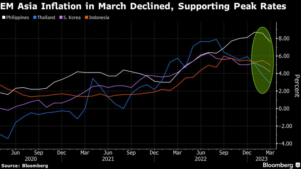 March headline inflation data from Indonesia, South Korea, Thailand and the Philippines all undershot estimates this week, bolstering peak-rate expectations.