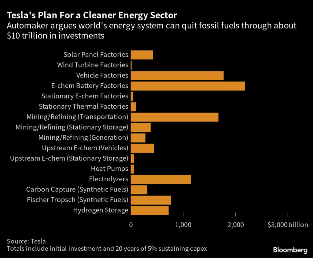 While the $10 trillion investment cost of a cleaner world is high, Musk argues that’s just a fraction of the $100 trillion global economy and entirely feasible when spread out over two decades.