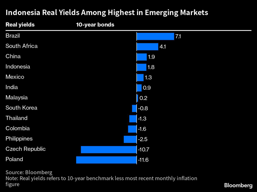 At the same time, headline inflation slid to 4.97% from 5.47%, helping make Indonesia’s 10-year inflation-adjusted yield — currently around 1.73% — the fourth highest of 13 major emerging-market economies.