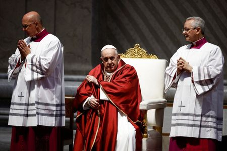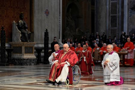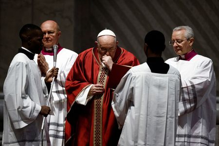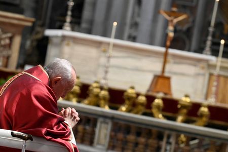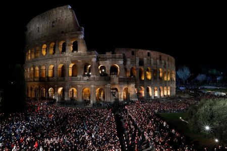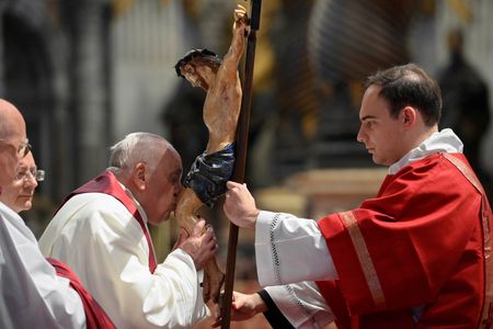 ROME (Reuters) -Pope Francis presided at one indoor service on Good Friday, but doctors ordered him to skip an outdoor evening “Way of the Cross” procession at Rome’s Colosseum after being hospitalised last week for bronchitis.