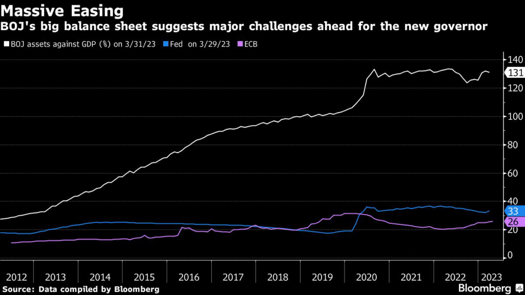 He spent $11.7 trillion to keep his stimulus rolling, making the BOJ’s balance sheet multiple times bigger than those of the Federal Reserve and European Central Bank, relative to the size of the economy.