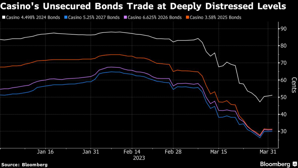 The company’s bonds trade at deeply distressed levels and the shares plunged 61% over the past year. Casino has enough liquid assets to meet next year’s debt maturities, but its ability to meet 2025 obligations will depend on a raft of factors, including favorable economic and financial conditions as well as successful asset sales and improved cash flow, S&P analysts wrote in a note on Monday.