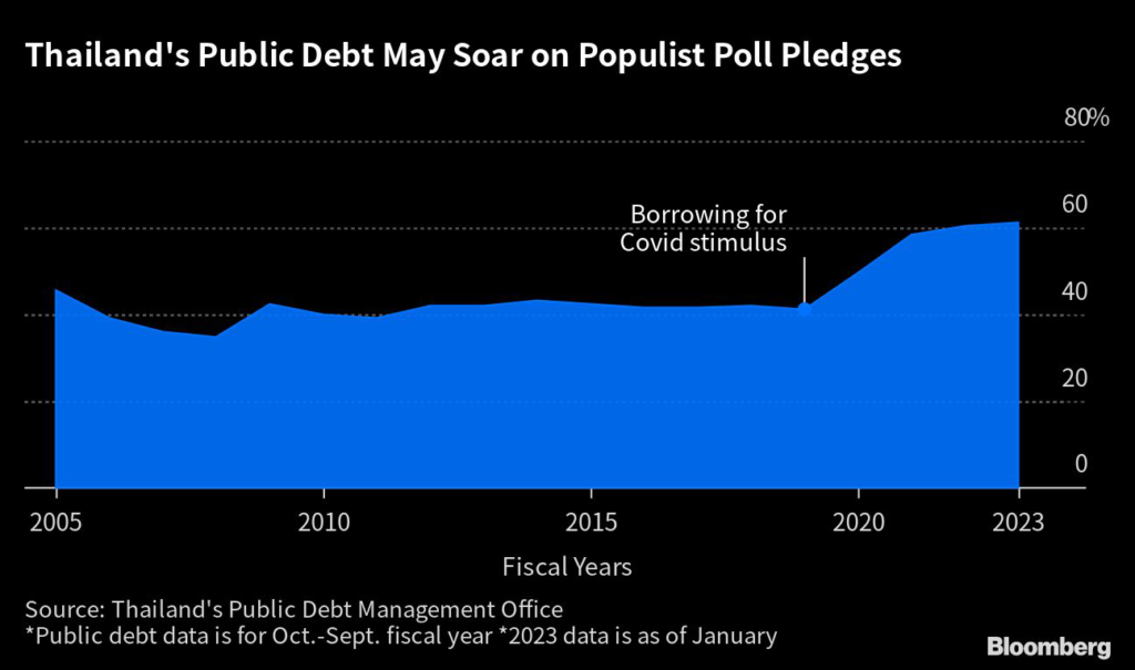 With Thais battling near-record household debt and the economy growing at the slowest pace in the region, all the major parties are pledging freebies such as cash and debt suspension to woo voters, raising concerns such measures may widen state debt and further fuel inflation.