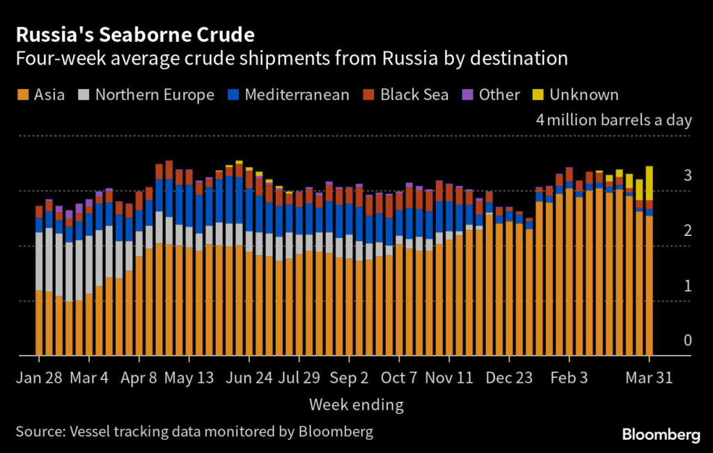 Crude shipments from Russia’s ports hit a new high in the final week of March, topping 4 million barrels a day.