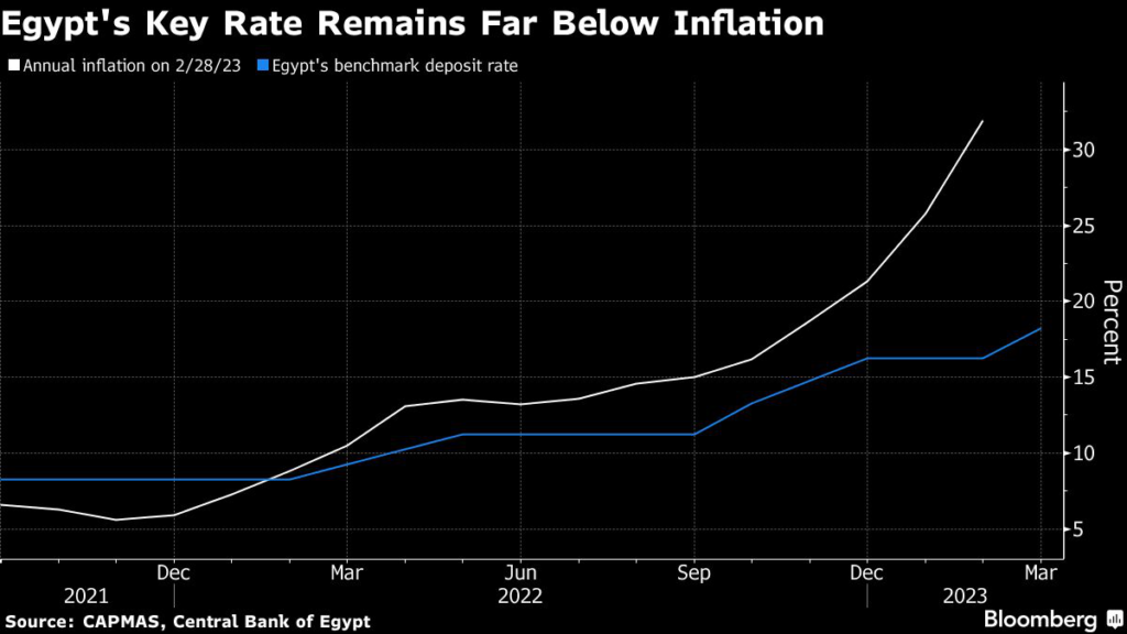 (Bloomberg) — Inflation in urban parts of Egypt rose to its highest since the aftermath of a currency crisis in 2016, following a surge in food prices linked to the devaluation of the country’s pound.