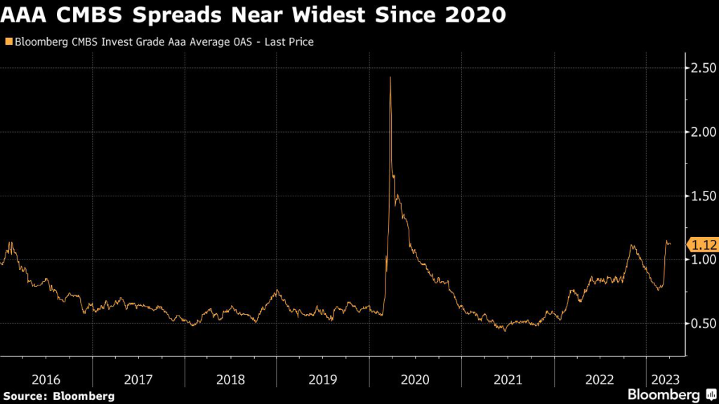 strategists recently recommended a “neutral” allocation to some types of top rated CMBS, up from underweight. Spreads were driven up by concerns over banking system stress which pushed up market volatility, BofA’s Alan Todd said in an interview.
