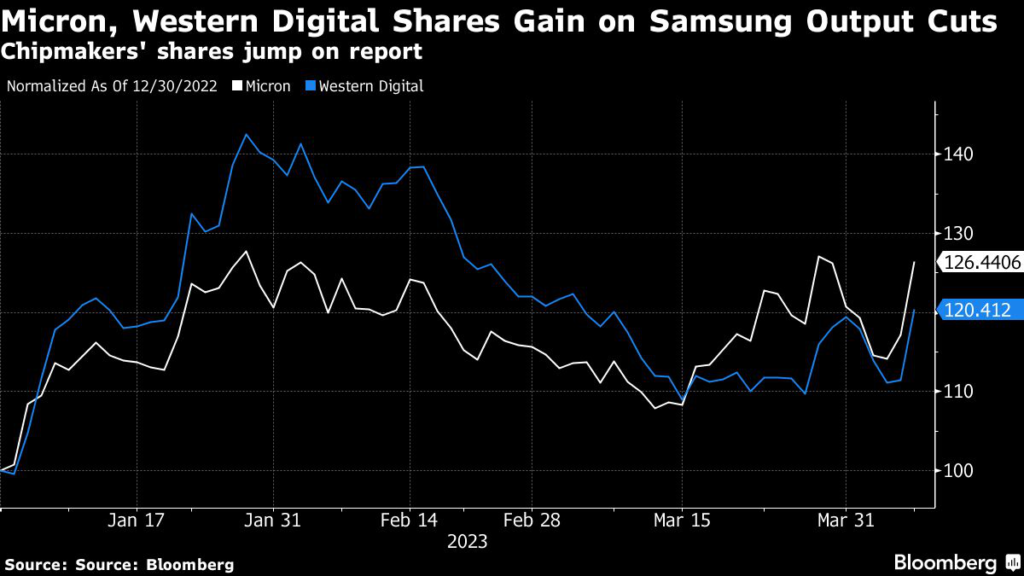 (Bloomberg) — Samsung Electronics Co.’s pledge to cut memory chip production has lifted shares of rival manufacturers because the move could potentially ease a supply glut that’s hammered prices across the industry.