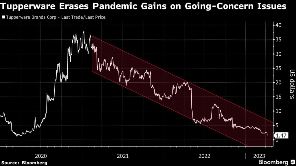 (Bloomberg) — Tupperware tumbled nearly 49% Monday, the largest drop on record, to notch an all-time low after the company said it hired financial advisers “to help improve its capital structure and remediate its doubts regarding its ability to continue as a going concern.”