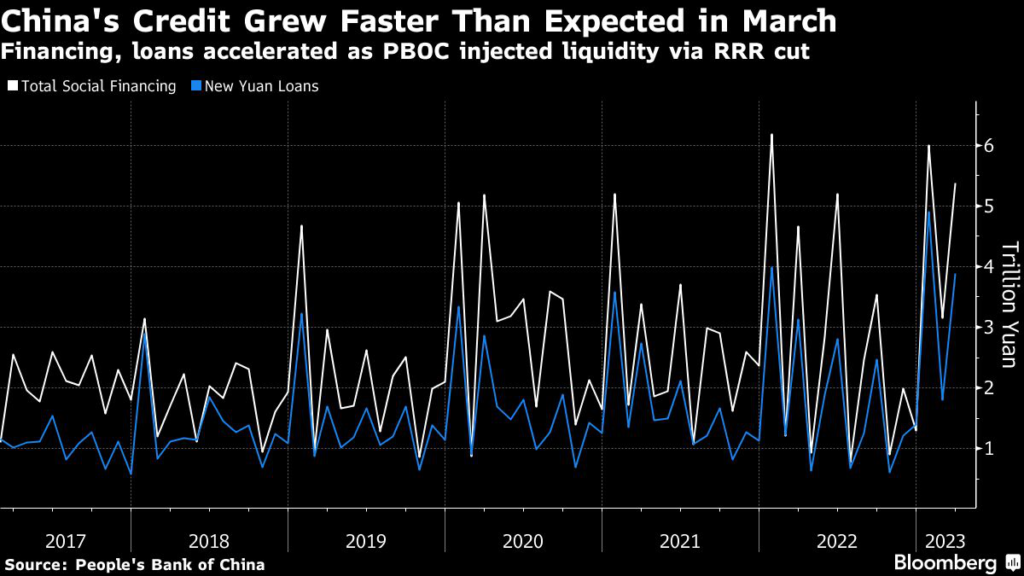 (Bloomberg) — China’s credit expanded faster than expected in March, a sign that the central bank’s moves to unleash more long-term liquidity into the economy and support bank lending is fueling investment activity.