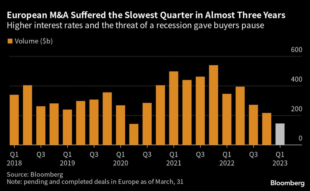The value of deals in Europe has slumped almost 60% in the first quarter from a year earlier, according to data compiled by Bloomberg.