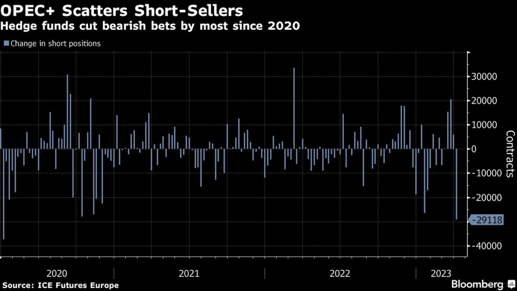 Money managers slashed short-positions in Brent crude by 29,118 contracts in the week to April 4, the sharpest drop since 2020, according to data from ICE Futures Europe.