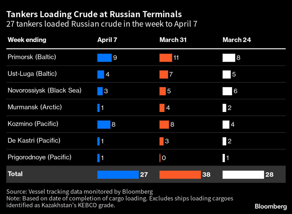 A total of 27 tankers loaded 20.2 million barrels of Russian crude in the week to April 7, vessel-tracking data and port agent reports show.