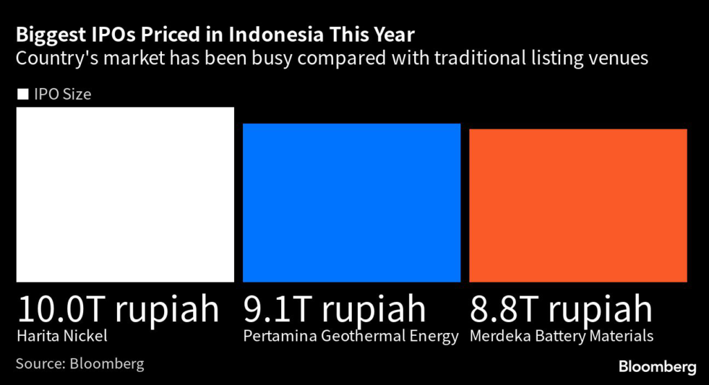 Prior to Harita Nickel, 11 companies debuted in Jakarta after raising at least $500 million, according to data compiled by Bloomberg. Within that group, three dropped on the first day of trade, two ended unchanged and six finished above the listing price.