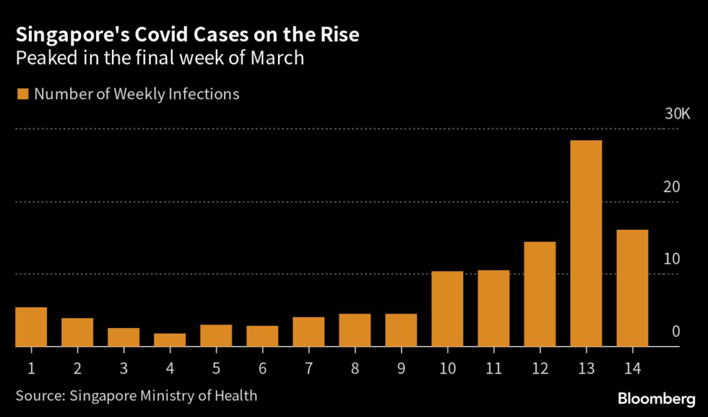 In Singapore, which dropped most mask mandates in February due to the significantly reduced threat from Covid, weekly cases topped 28,000 by the end of March, up from 14,467 a week earlier.