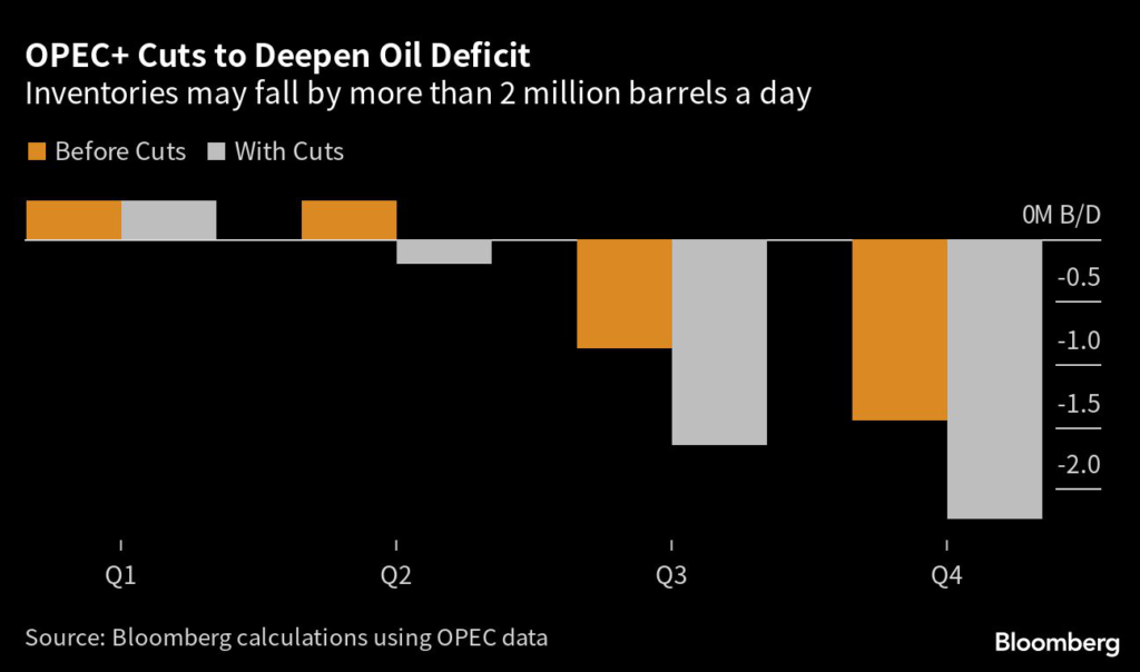(Bloomberg) — Oil supply cuts agreed by OPEC+ nations last week are putting global markets on track for a hefty supply deficit that will widen as the year progresses, the latest data from the group indicate.