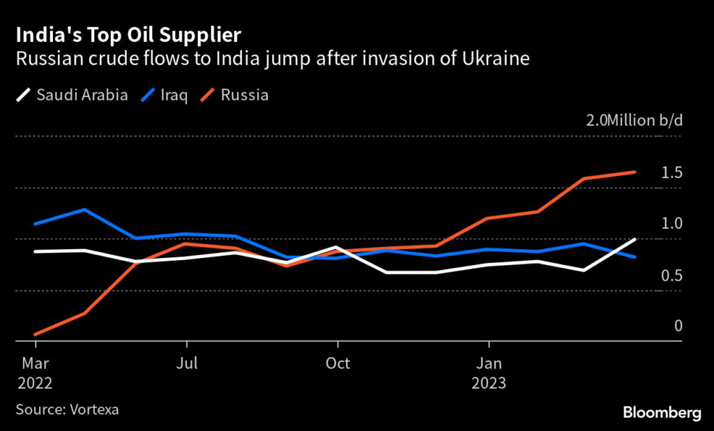 The South Asian nation has taken advantage of cheaper barrels, purchasing record volumes and elevating Russia to its top supplier above Iraq and Saudi Arabia.